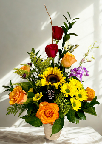 Add a joyful touch to Mom’s day with a vibrant mix of roses, mini-roses, hydrangeas, and stocks. Bursting...