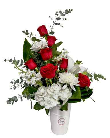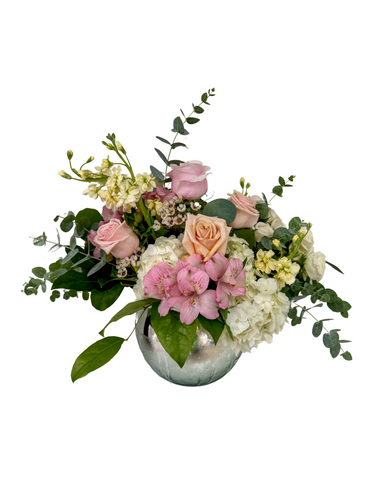 Our Bowl of Beauty arrangement, features a stunning mix of roses, mini roses, alstroemerias, hydrangeas, stocks, wax flowers,...