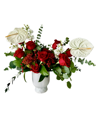 Impress your loved one with this beautiful bouquet, featuring 8 roses, anthuriums OR stocks flowers, hypericum, and eucalyptus...