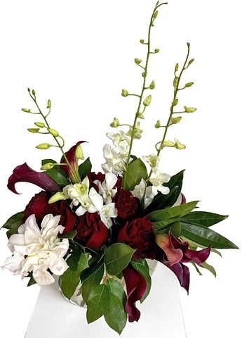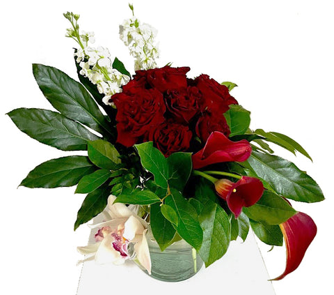 Roses, callas, lilies, and dendrobium orchids, with assorted greenery, on a glass vase. *** Note: Depending on availability at...