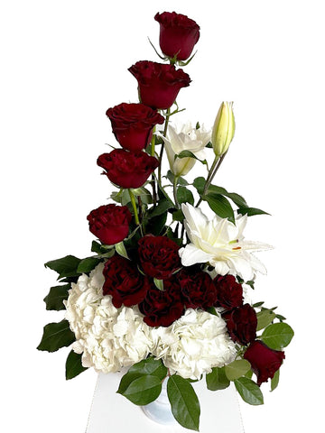 Perfect for any occasion, is this stunning spiral mixed arrangement of hydrangeas, 12 roses and elegant lilies. Add...