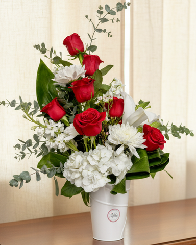 Show your love with this stunning bouquet, featuring 8 roses, hydrangeas, lily, cremons, stocks, and mixed greenery in...
