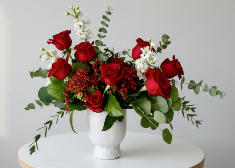 Impress your loved one with this beautiful bouquet, featuring 8 roses, stocks flowers, hypericum, and eucalyptus foliage, arranged...