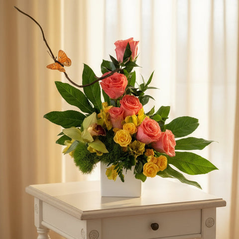 These stunning arrangement includes a mix of 6 roses, spray roses, and elegant cymbidium orchids, complemented by lush...
