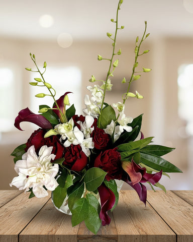 6 roses, 6 callas, lilies, and dendrobium orchids, with assorted greenery, on a glass vase. *** Note: Depending on...