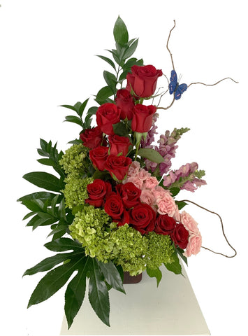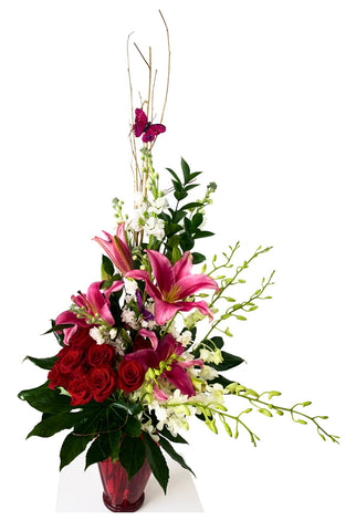 This beautiful and curvy arrangement features a variety of flowers, including roses, lilies, orchids, and stock flowers, complemented...