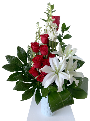 Our one-of-a-kind arrangement showcasing 12 gorgeous roses, graceful lilies, and sweet-smelling stock blooms, all set off by lush...