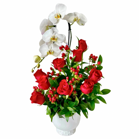 Fall in love with the perfect pairing of 12 beautiful roses and a spectacular Phalaenopsis plant. Once the...
