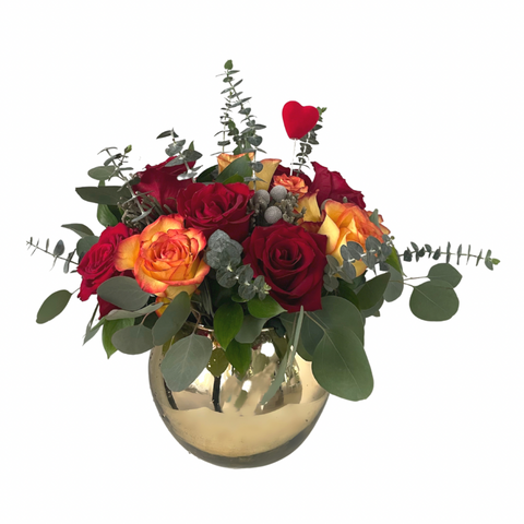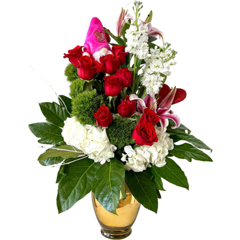 Heart shaped “purse”, with 15 roses, mini-roses, stocks, and love gnome. *** Note: Depending on availability at the time...