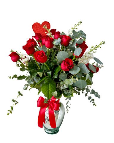 Celebrate love with this arrangement that contains 6 beautiful roses, lilies, filler and a heart-shaped greenery detail. Show your love...