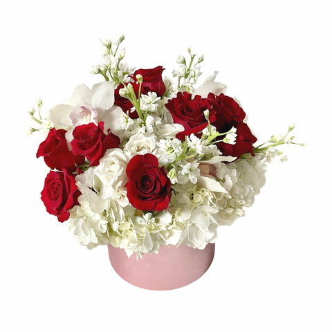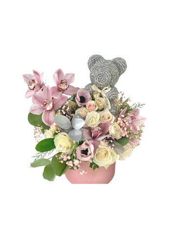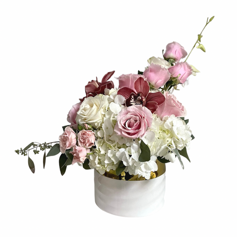 A beautiful and refined composition featuring roses, mini roses, Cymbidium and Dendrobium orchids and hydrangeas. All artfully arranged...
