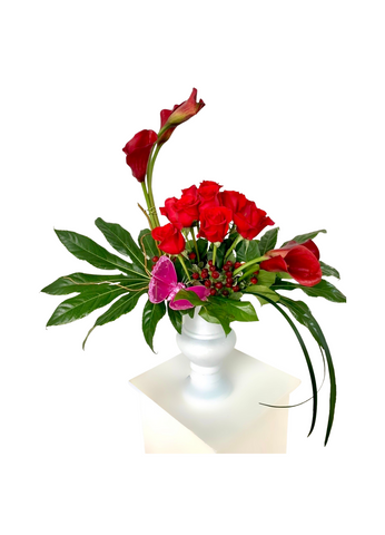 Adorned with 8 beautiful roses and delicate callas, this cute small arrangement is perfect for any occasion, specially...