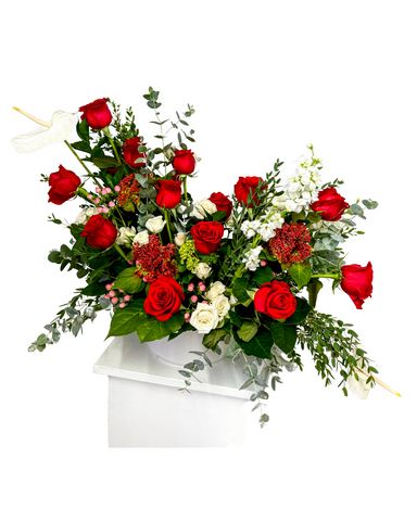 A captivating mix of anthuriums, roses, mini roses, stocks, hypericum, and mixed foliage, elegantly arranged on a flat...