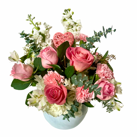 A delightful mix of flowers and greenery, perfectly arranged in a charming ceramic bowl. Includes roses, carnations, stock...