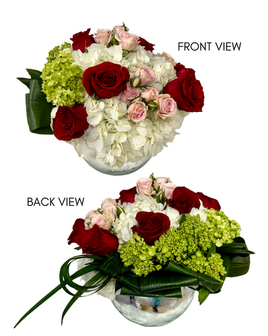 Our Bowl of Beauty arrangement, features a stunning mix of roses, mini roses, alstroemerias, hydrangeas, stocks, wax flowers,...