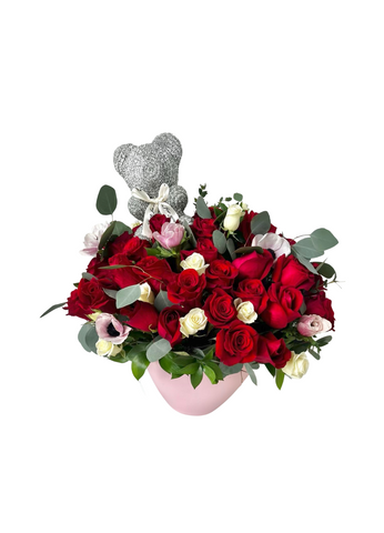 Celebrate LOVE with 25 beautiful roses, fragrant stocks, and lush mixed foliage, all elegantly arranged in a silver...