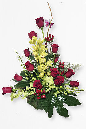 A beautiful and refined composition featuring roses, mini roses, Cymbidium and Dendrobium orchids and hydrangeas. All artfully arranged...