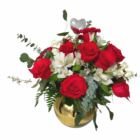 Indulge her with our beautiful round bouquet, that features an assortment of 12 roses, mini-roses and eucalyptus, elegantly...
