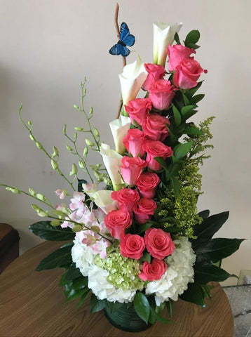 Featuring a variety of stunning flowers, including orchids, callas, and hydrangeas, as well as lush greenery, this lovely...
